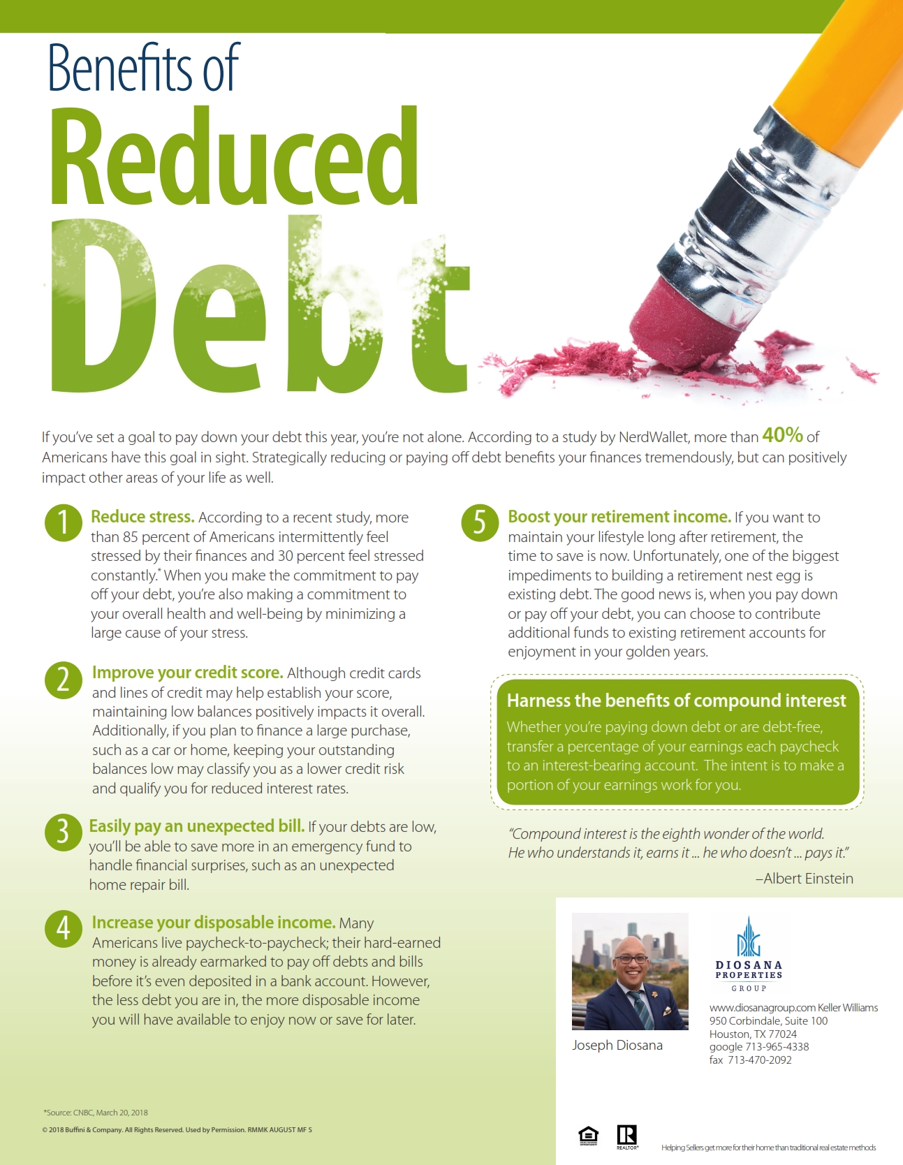 The information I’m sending this month outlines seven benefits of reduced debt. The benefits range from the reduction of your monthly expenses and improving your long-term financial security to minimizing stress and modeling good financial habits for children and others seeking debt-free lives. If you’re already debt-free, the piece will reinforce the tremendous benefits of maintaining your lifestyle. If you’d like to reduce your debt, page two provides several tips to help you on your journey toward your goal.