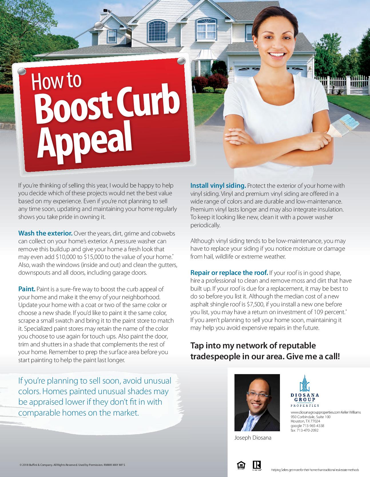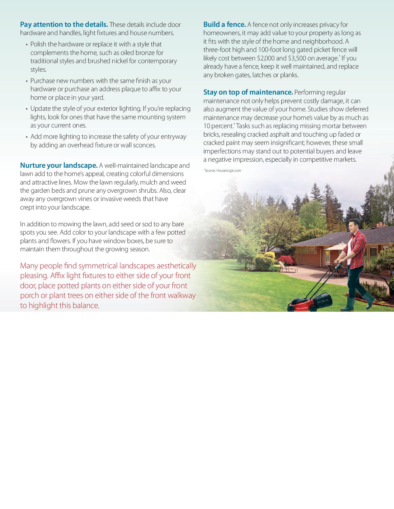 Here’s some information intended to help you improve your home’s curb appeal, including eight tips designed to make the home’s exterior and landscape appear more attractive to potential buyers. Not thinking of selling right now? These tips will also help you maintain your biggest investment—your home—and make it the pride of your neighborhood, until the day you decide to list.