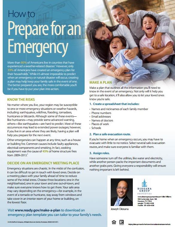 The information I’m sending this month offers tips on how to create a plan that will help you and your family in the event of an emergency. It covers everything, including: deciding on a meeting location, collecting documents and practicing your plan on a regular basis . You may not be able to control if or when an emergency will happen, but you are able to control your preparation for it; and preparation equals safety.