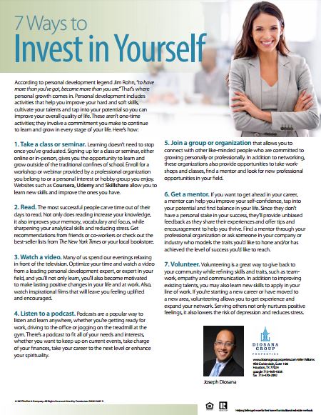 This month, I’m sending information that outlines seven ways to invest in yourself through a commitment to personal growth. From taking seminars and reading more books to listening to podcasts and finding a mentor or coach, the list includes options for even the busiest person. The piece also includes the benefits of adopting a growth mindset and committing to lifelong learning and personal development.