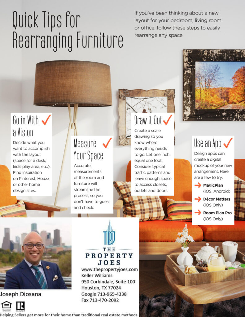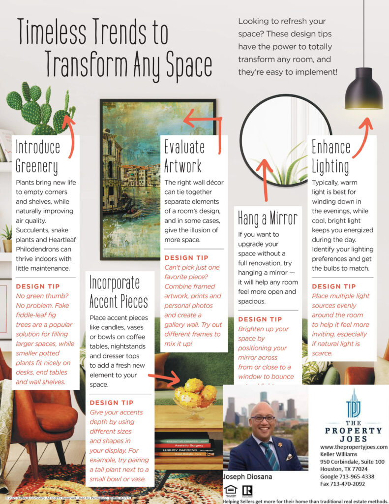 The information I’m sharing with you this month will help give your place new life with timeless interior design trends. These trends are easy to incorporate and can totally transform any room in your house. You’ll find tips on how to expertly use lighting, decorative accents, greenery and more, plus, a method for rearranging furniture that takes the guesswork — and unnecessary heavy lifting — out of it. You’ll love seeing how these small changes can impact your home in a big way.